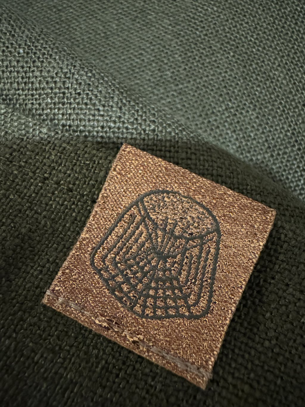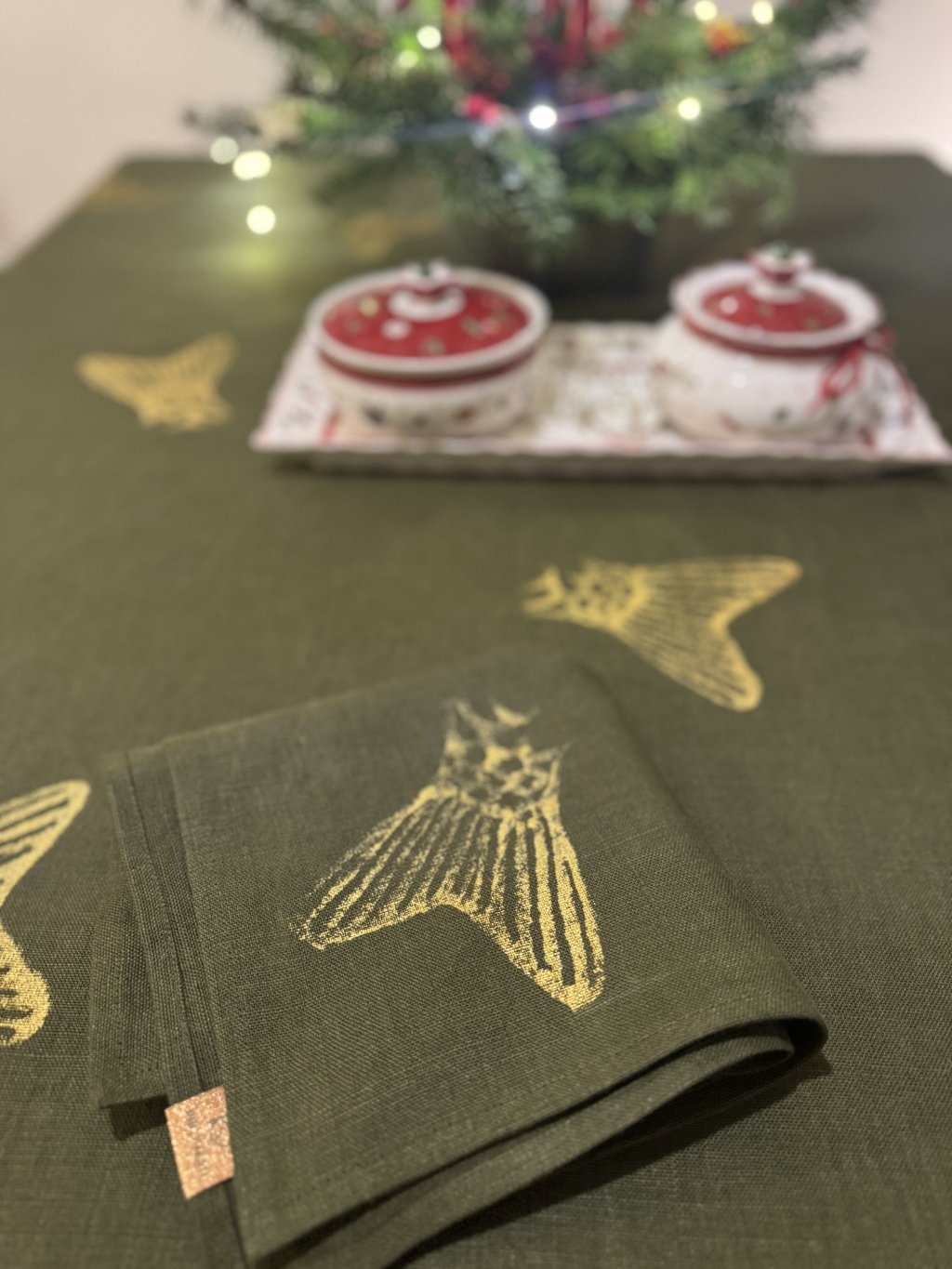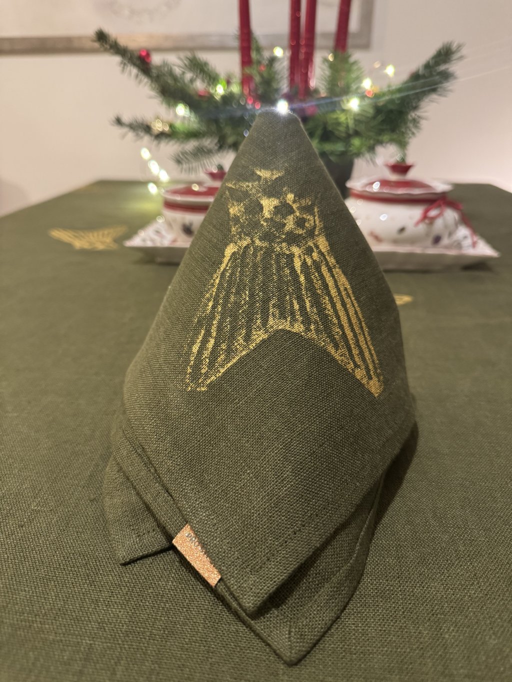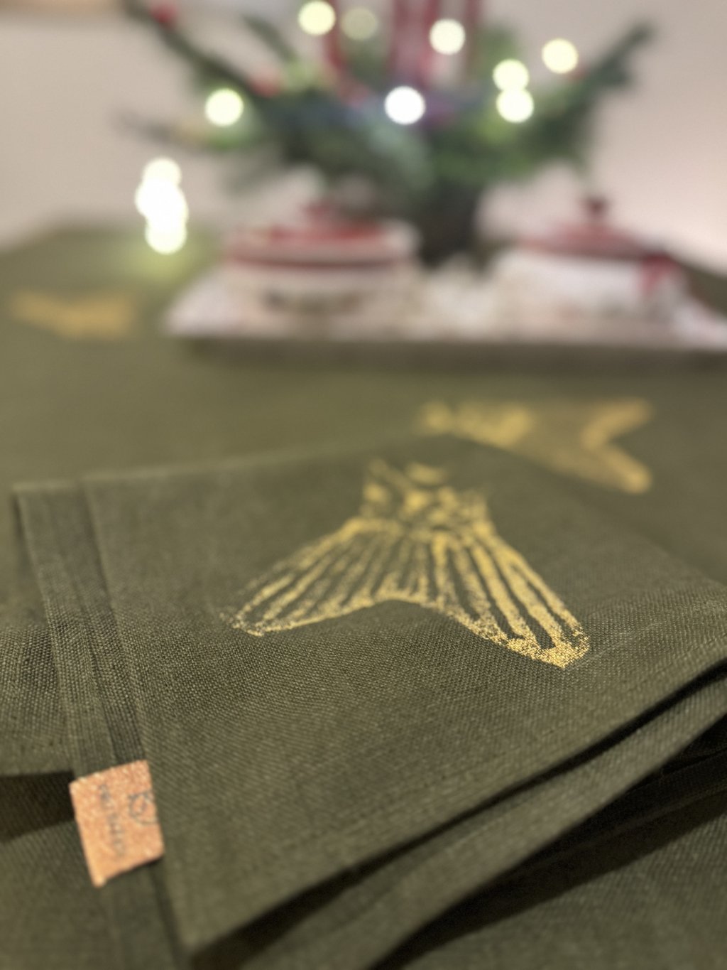 LNĚNÁ PROSTÍRKA/UBROUSEK OLIVOVÁ - SE ZLATÝM RUČNÍM TISKEM 33 x 33cm