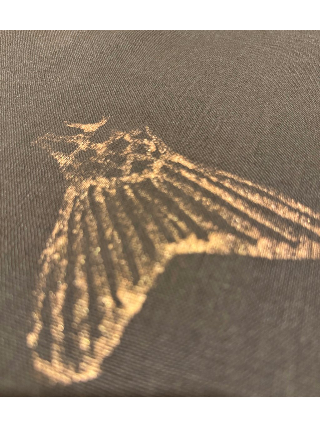 Zdobeno ručním autorským tiskem stylizované rybí ocasní ploutve v jemném odstínu světle zlaté, díky kterému je každý kus naprostým originálem.