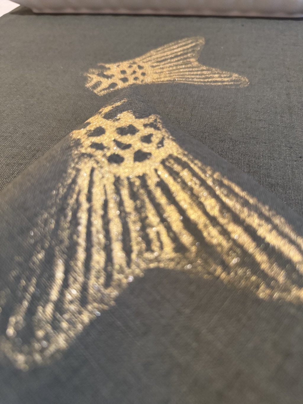 Zdobeno ručním autorským tiskem stylizované rybí ocasní ploutve v jemném odstínu světle zlaté, díky kterému je každý kus naprostým originálem.