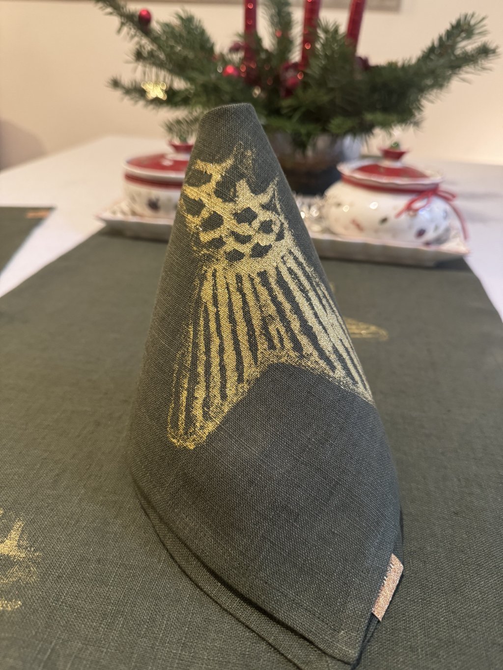 LNĚNÁ PROSTÍRKA/UBROUSEK ZELENÁ - SE SVĚTLE ZLATÝM RUČNÍM TISKEM 33 x 33cm