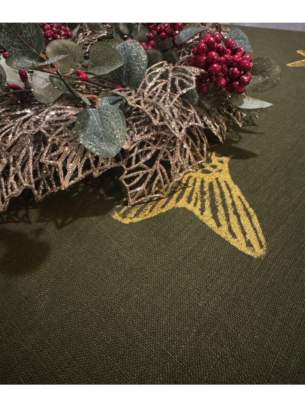 UBRUS LNĚNÝ OLIVOVÝ SE ZLATÝM TISKEM 150 x 200 cm